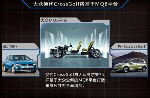 MQB平臺(tái)是目前大眾最重要的戰(zhàn)略之一,其最大的特點(diǎn)就是車身尺寸可以進(jìn)行變化。大眾高爾夫作為該平臺(tái)推出的首款車型,車身尺寸較高爾夫6均得到提升。目前高爾夫7的長(zhǎng)寬高分別為4255mm/1799mm/1452mm,軸距為2637mm。相比高爾夫6車型,車輛的車身長(zhǎng)度加長(zhǎng)56mm,軸距加長(zhǎng)59mm。根據(jù)這樣的改變,未來(lái)基于高爾夫7進(jìn)行換代的crossGolf車型尺寸也將與高爾夫相同,但是高度會(huì)更高一些。