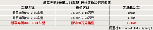 一汽奔騰經銷商向記者表示,新款B90車型除了外觀造型上有著很大的變化外,在動力方面也進行了全面的優化,將搭載一汽轎車自主研發的1.8T渦輪增壓發動機,與之相匹配的是一臺6速手自一體變速箱。據悉這款發動機的最大功率為137kW,動力性能全面超越了目前現款車型所搭載2.3L汽油發動機。新車推出后,在售價方面也將有所提高。按照目前2.3L頂配車型19.98萬元的售價來看,新款B90 1.8T版的起售價將高于20萬元。