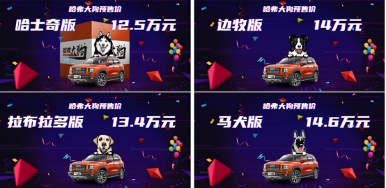 本次預售活動,哈弗大狗在哈弗智家APP、天貓、京東、蘇寧、汽車之家、易車等官方旗艦店均有開設了預售通道,除了可享受12.5萬-14.6萬的超值預購價外,同時還可享受八重驚喜禮遇:包括盲盒幸運禮、增值加享禮、減壓金融禮、誠意置換禮、愛寵保養禮、終身質保禮、無限流量禮、潮玩試駕禮,折合優惠價值達萬元以上。