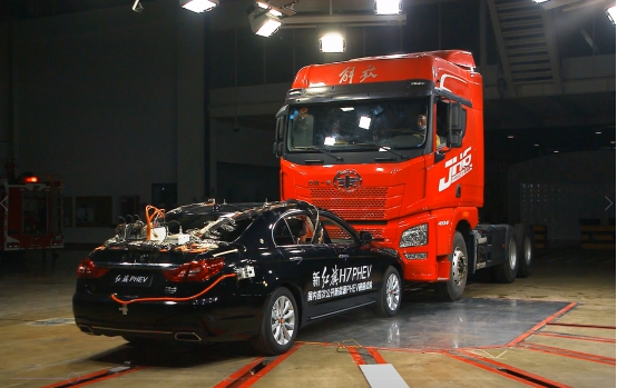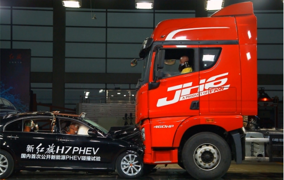 12月28日,中國一汽進行了新紅旗H7 PHEV轎車與解放JH6卡車碰撞試驗。試驗選擇位于天津的中國汽車技術研究中心碰撞試驗室權威機構,試驗條件模擬實際交通環(huán)境中,轎車與大貨車正面對撞事故情況,用仿真假人模擬實際駕乘狀態(tài),試驗取得了圓滿成功。國內多家媒體近百人見證這一時刻。