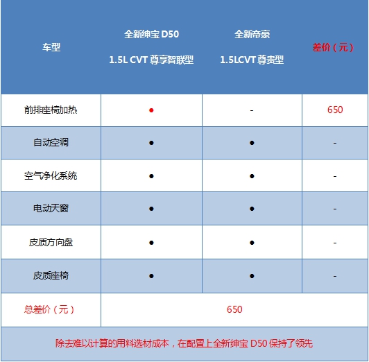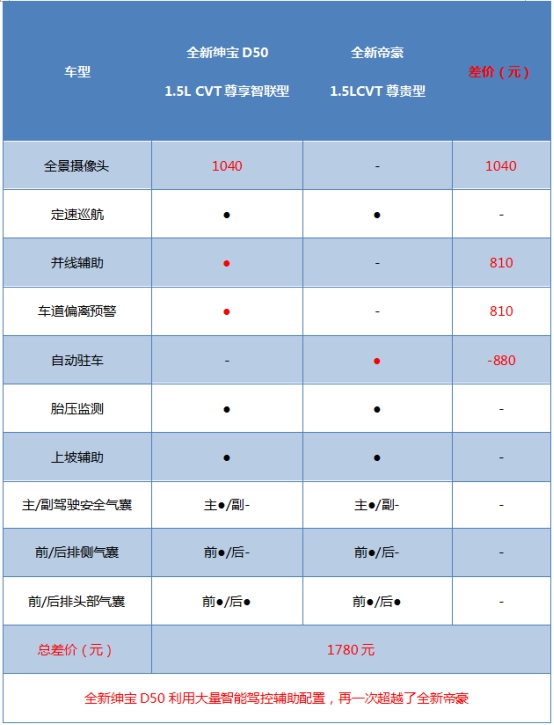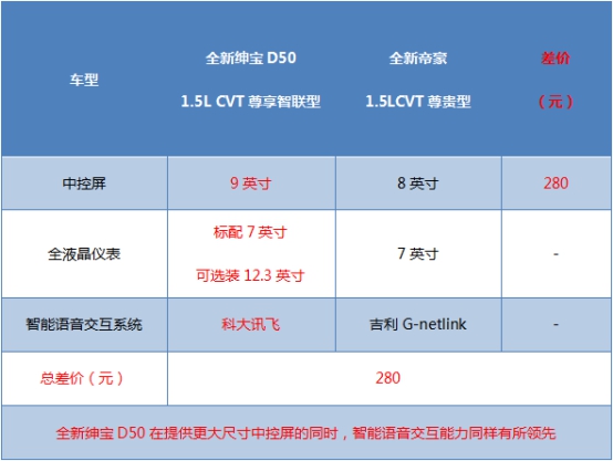 通過對比可以看出,無論是在硬件層面或是軟件部分,全新紳寶D50均以造價更加高昂的配置與親民價格形成反差,滿足了用戶對于性價比要求的同時,也進(jìn)一步提升了我們的整體行車品質(zhì)。