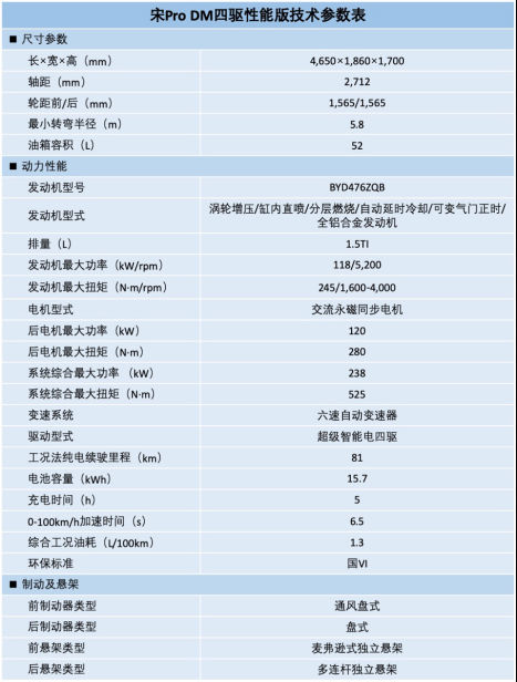 全新架構的第一大特點就是省,P0電機和15.7kWh大容量電池配合起來讓宋Pro DM性能版的經濟性達到了全新高度。一方面,P0電機可以在更多時候利用過剩能源發電,一方面,大容量電池帶來了高達81公里的純電續航里程!宋Pro DM四驅性能版的百公里綜合油耗低至1.3升,饋電狀態下的百公里油耗也只有7.2升,車主日常使用的實際油耗在兩者之間,綜合續航里程長達約800公里,優于市場上同級別SUV。但更值得稱道的是,在實現高經濟性的同時,宋Pro DM四驅性能版并沒有犧牲卓越用車者所追求的動力性!