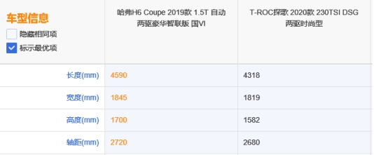 而且雖說兩車都是緊湊型SUV,但一個(gè)不容忽視的是,新哈弗H6 Coupe的尺寸比探歌大了一圈,2720mm的軸距也更長。
