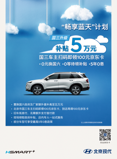 在購車優惠方案方面,根據北京現代“暢享藍天”計劃顯示,北京市國三車主采用國三車置換北京現代新車,一方面可以享受由國家和北京現代共同提供的最高綜合補貼5萬元、更可以使用舊車直接抵扣新車首付款、現場即時領取政府補貼,將優惠力度最大、最速化;另一方面,國三車主還可享受分期購車最長5年0利息的金融方案、掃碼到店分獲100元京東卡優惠,在安心選購北京現代新車的同時,全面緩解了國三車主置換新車的經濟壓力。