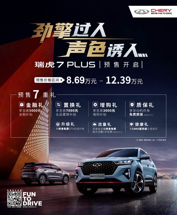 據悉,瑞虎7 PLUS已開啟預售,不僅提供8.69萬元-12.39萬元的親民預售價,還在預售期間下帶來金融禮、置換禮、增購禮、質保禮、升級禮、流量禮、健康禮等“預售7重禮”,感興趣的朋友千萬不要錯過!
