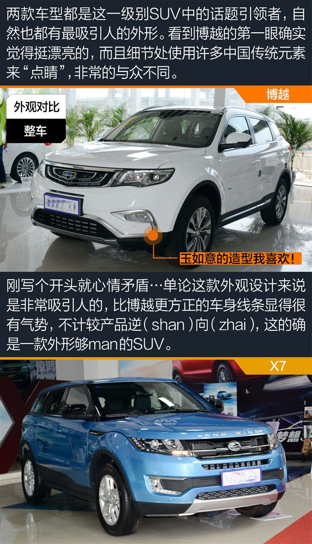 >>>小結:網上對博越的各路好評真的不用贅述了,經過本人親測,從外形到內飾做工的確要超過同價位車型,只是油耗和動力部分還需要市場和車主們長期的驗證。雖然從個人角度看,“抄作業”始終是不太好的行為,但再往實用部分看看,X7的內飾配置動力也確實展示了很大的誠意。段子笑笑就過去了,日子還是要經濟實惠的好,是吧?