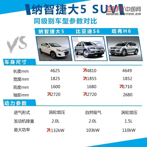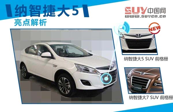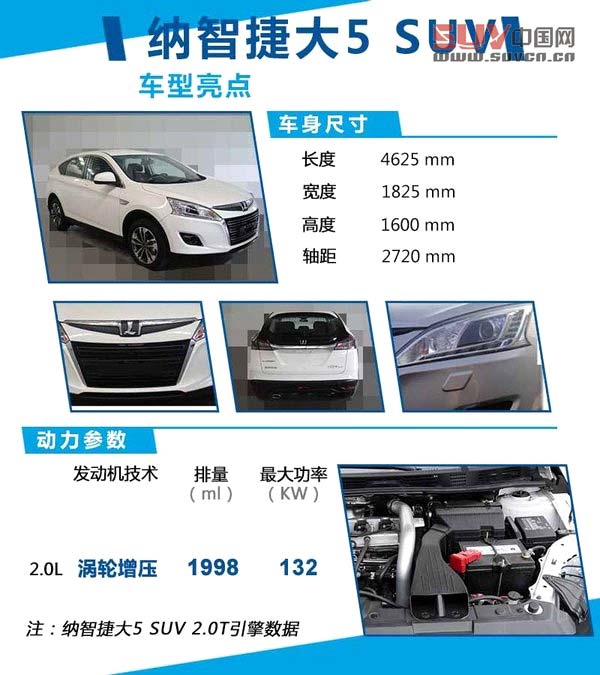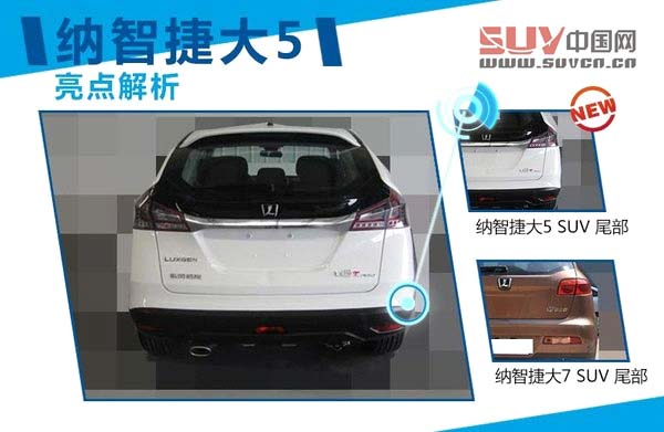 該款納智捷大5基于納智捷S5平臺打造,定位于緊湊級SUV,而在外觀設計上延續了家族化設 計理念,掀背式設計的同時帶有尾翼,整體造型更加協調。新車預計售價15萬元以上,2720mm的軸距在同級別車型中處于優勢地位,而在動力表現方面,納智捷所采用的2.0T發動機則更加出色。