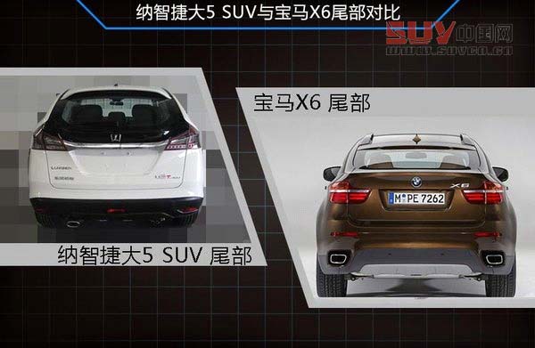 納智捷大5 SUV車身長寬高分別為4625mm/1825mm/1600mm,其2400mm的軸距則體現了其城市緊湊級SUV的個性特征。而在動力配置方面,新車還將搭載東風裕隆最新調校的2.0L渦輪增壓引擎,屆時該款新車最大功率將達到132kW,與之匹配的則有望是5速自動變速箱和6速手自一體變速器。另外,納智捷大5 SUV尾部與寶馬X6尾部相比較為相似,均采用遛背式設計,形狀均顯得圓潤豐滿,整體時尚感十足。
