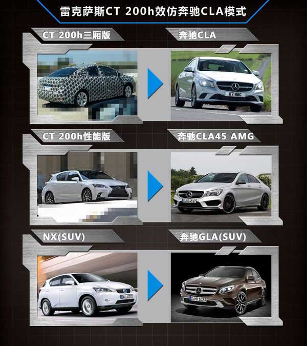 CT200h是雷克薩斯首款全系配備混合動(dòng)力系統(tǒng)的A級(jí)豪華轎車車,同時(shí)也是雷克薩斯“混合動(dòng)力元年”的代表車型。此前,奔馳基于MFA前驅(qū)模塊化平臺(tái)打造了CLA(三廂),且將于明年國產(chǎn),而該平臺(tái)衍生出的奔馳CLA45 AMG(性能版)和奔馳GLA(SUV)也有望在未來兩年引入國內(nèi)。對(duì)此,雷克薩斯也將基于CT 200h平臺(tái),衍生出3款車型,包括CT 200h三廂版,CT 200h性能版和SUV車型-CX 200h。