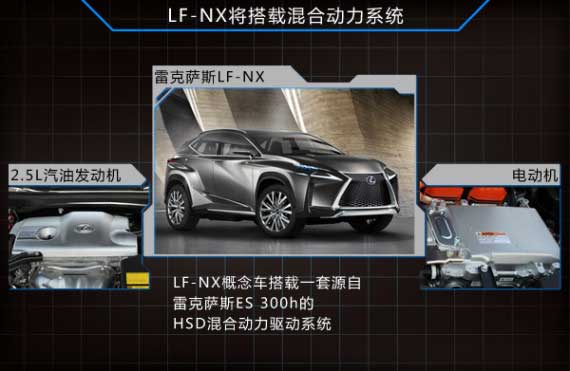 動力方面LF-NX概念車搭載一套源自雷克薩斯ES 300h的HSD混合動力驅動系統,這套系統由最大功率為118kW的2.5L汽油發動機與最大功率為105kW的電動機組成,綜合功率達到151kW。Nobuyuki Tomatsu表示:概念車的這套動力只是入門選擇,量產車將有望提供四驅系統。