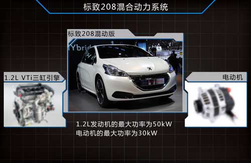 標致208混動版將搭載由一臺1.2L VTi三缸汽油發動機和一臺電動機組成的混合動力系統,其中1.2L發動機的最大功率為50kw,電動機的最大功率為40kw,該混合動力系統技術來源為標致908 Hybrid賽車,后者是標致在勒芒24小時耐力賽的冠軍車型。