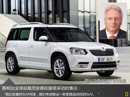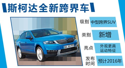 大眾集團旗下斯柯達品牌在推出明銳以及新款Yeti后,其也在將產品線向更多細分市場拓展。斯柯達全球總裁范安德先生曾表示:“斯柯達的產品將會更多,我在考慮將來為斯柯達的SUV家族增加一些新成員?!睂τ谖磥懋a品的拓展方向,趨于運動的車型將成為重點之一,范安德表示:“我比較看好SUV市場,我們甚至可以考慮推出一款更具運動性的SUV?!苯招【帿@取了一款斯柯達全新跨界車的假想圖,該車將與未來將推出的中型SUV共同基于大眾MQB平臺進行開發,未來上市后將與本田歌詩圖等中型跨界車競爭。