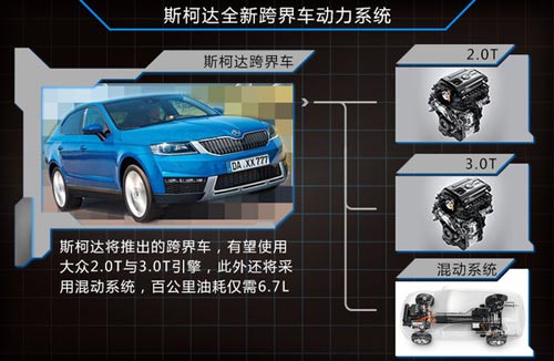 在動力方面,斯柯達未來將推出的跨界車,將有望使用使用大眾的2.0T與3.0T引擎。其中3.0T引擎目前已使用于大眾途銳車型,其最大功率為213千瓦,峰值扭矩達到420牛米。此外除傳統動力外,斯柯達跨界SUV還將使用混動系統,其使用一臺柴油發動機并搭配兩個電動馬達所組成的混動系統。在混合動力情況下可行駛約1064km里程,百公里油耗僅為6.7L。
