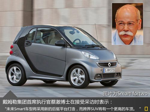 縱觀smart產品線,目前其只是推出了一款smart Fortwo車型。面對這樣的局面,蔡澈博士已經意識到了產品不夠豐富的情況,他在接受采訪時透露:“Smart公司未來推出的產品均將基于smart公司自行研發的后置引擎后驅平臺。采用該平臺將使得smart旗下的產品很好的與梅賽德斯-奔馳公司旗下的產品區分開來,并具有鮮明的特點。”未來將投產的smart 跨界車也將基于此平臺打造,并有望于2016年正式發布。