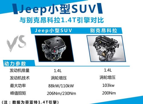 Jeep計劃推出的全新小型SUV,根據車型定位將競爭對手鎖定為別克昂科拉等車型。新車有望搭載的菲亞特1.4T渦輪增壓發動機,并將對其進行重新調校。現款引擎則提供高低功率兩個版本,最大功率分別為88kW和110kW,最大扭矩為206N·m和230N·m。相比昂科拉車型所搭載的排量同為1.4L的渦輪增壓引擎,其在動力方面具有一定優勢。
