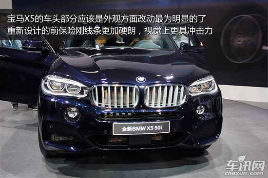 新一代寶馬X5采用了新家族式前臉,雙天使眼大燈與發動機蓋上四條硬朗的線條,雙腎式進氣格柵,與新3系如出一轍。新的霧燈位置看起來很獨特,而前保險杠底腳處造型類似字母b的裝飾也是X5的最新風格,新款大燈同樣是采用了切圓的天使眼以及LED燈組。