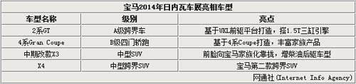 在今年1月份的底特律車展上,寶馬發布了如M3 Sedan、M4 Coupe在內的多款新車,即將開幕的日內瓦車展上(當地時間3月6日)寶馬將攜更多全新車型參展。記者為大家匯總了其即將參展的新產品,其中包括了2系GT、4系Gran Coupe、中期改款X3以及X4。在上述四款車型中,SUV已經占據了總數量的一半。