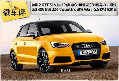 動力方面:S1將搭載一臺EA888 2.0升直列四缸渦輪增壓TFSI發動機,最大功率為231馬力,最大扭矩370牛米。S1則會搭配一臺6前速手動變速器或者6前速S-Tronic雙離合變速器,搭配使用瀚德Haldex中央差速器的quattro全驅系統。新車采用重新設計的多連桿獨立懸架,S1 Sportback版0-100km/h加速約5.9秒,S1三門版0-100km/h加速約5.8秒,兩車最高時速均為250km/h。