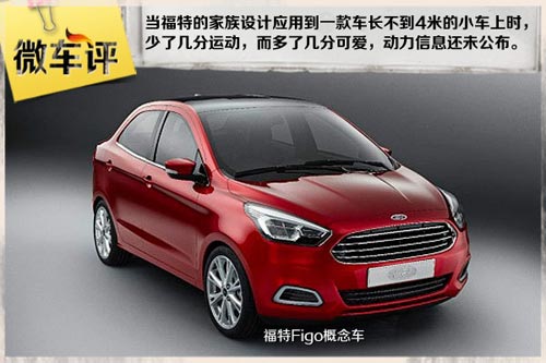 福特Figo概念車采用家族式設計理念,定位于小型三廂轎車。整車造型融入了時下流行的運動元素,尤其是時尚的前臉給人十分可愛的感覺,車身長度不到4米。