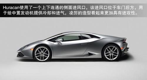 此外,Huracan使用了一個(gè)上下連通的側(cè)面進(jìn)風(fēng)口,該進(jìn)風(fēng)口位于車門后方,用于給中置發(fā)動(dòng)機(jī)提供冷卻和進(jìn)氣,凌厲的造型看起來更加具有進(jìn)攻性。
