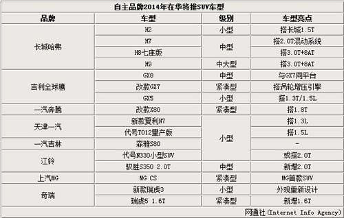 根據全國乘用車聯席會最新數據顯示,2013年前11個月國內SUV銷量達到了271.2萬輛,同比增長高達50%。在2013年的國內SUV市場中,各汽車廠家共推出了共有165款車型,包括69款全新車型,44款新增車型以及31款改款車型,展望2014年的中國SUV市場,由于哈弗H6、大眾途觀、本田CR-V等車型的熱銷,這一市場一直持續火爆,隨之產生的競爭也越來越激烈,其中自主品牌十分明顯,隨著大量中低端SUV進入市場,這一細分市場也將出現新的格局,而其他品牌也將推出新車以擴大市場份額,2014年在華推出的SUV車型將達到55款,在五大系品牌中,歐系及自主品牌表現強勁,日系和美系品牌則緊追其后,下面網通社為您盤點了2014年在華將推出的SUV,其中自主品牌占多數。