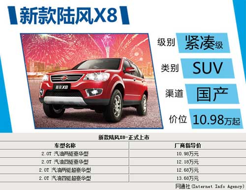 一直致力于打造中國(guó)自主高端SUV品牌的陸風(fēng)汽車(chē),于去年發(fā)布了首款城市型SUV“陸風(fēng)X5”,并規(guī)劃未來(lái)實(shí)現(xiàn)硬派SUV和城市SUV兩條產(chǎn)品線發(fā)展。同時(shí)在動(dòng)力總成方面,陸風(fēng)汽車(chē)也計(jì)劃全面升級(jí)。日前記者從陸風(fēng)汽車(chē)官方獲悉,硬派SUV新款陸風(fēng)X8正式上市,售價(jià)區(qū)間為10.98萬(wàn)-13.98萬(wàn)。新車(chē)最大的變化,便是采用了全新2.0T+6MT的動(dòng)力組合。值得一提的是在換裝全新動(dòng)力系統(tǒng)后,新款陸風(fēng)X8的官方百公里油耗僅為6.2L。