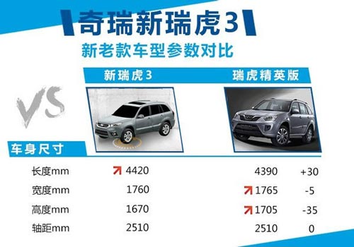 同時我們也于日前得到了瑞虎3的申報圖,按照瑞虎3的產品定位將低于瑞虎5,主打時下小型SUV市場。在整車尺寸方面,瑞虎3長寬高分別為4420mm/1760mm/1670mm。與現款瑞虎相比,長度高出了30mm,而寬度和高度相比現款分別減少了5mm/35mm,軸距仍為2510mm。