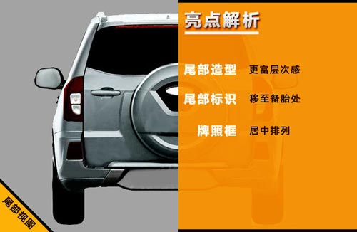 新車在外觀造型經過重新設計后,進氣格柵上的LOGO將換裝全新奇瑞標識,同時霧燈區域新增LED日間行車燈,令前臉顯得更為時尚精致。與前臉細微變化相近,車尾的LOGO標識將移至背負式備胎上,車門把手和牌照框都進行相應的微調,相比現款車型,瑞虎3的尾部造型更富層次感。