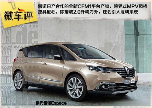 新款Espace設計思想來源于在2013年法蘭克福車展亮相的雷諾Initiale Paris概念車。新款Espace將會基于雷諾-日產聯盟全新的CFM1平臺,整體風格主打跨界元素,在傳統MPV基礎上融入了SUV車型的設計理念,這使得新車造型更加獨特極具吸引力。換代Espace將有所增大,依然提供7座版車型,內部空間靈活度會更高。