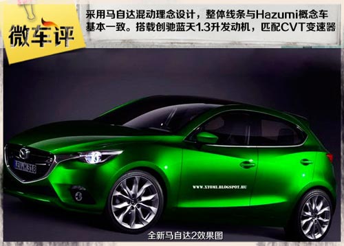 日前,網絡上曝光了一張全新一代馬自達2的最新假想圖,這款車基于馬自達Hazumi概念車設計而來,預計將在2015年上市。
