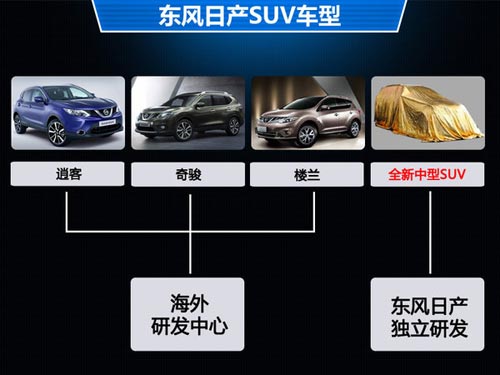 目前東風日產在售SUV包括奇駿、逍客及樓蘭三款車型均是依托海外研發中心,其中奇駿是在日本本土的日產先進科技中心研發,而逍客是日產歐洲設計中心成立以來的第一款作品,樓蘭則主要是美洲地區日產研發中心的產物。上述車型只是針對中國本土化進行相應的調整,隨著東風日產研發中心的不斷成熟,未來推出介于在奇駿和樓蘭之間的中型SUV將是東風日產首款獨立研發車型,售價或在25-35萬之間,推出后將與廣汽豐田漢蘭達產生競爭。