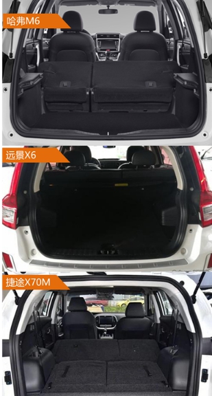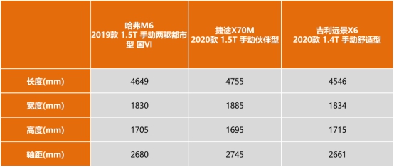 哈弗M6的車身尺寸為4649×1830×1705mm,軸距2680mm,內部駕乘空間可以媲美中型SUV,日常代步或者舉家外出空間都可以游刃有余。遠景X6在寬度和高度上略優于哈弗M6,但由于哈弗M6在長度和軸距優勢更明顯,所以后排的乘坐空間哈弗M6完勝。捷途X70M作為中型SUV,綜合數據上要略優于緊湊型SUV哈弗M6和遠景X6。