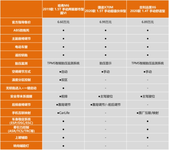 居家過日子誰都講究舒適,家用車重要的是開得順手坐著舒服,配置花里胡哨不頂用,夠實用才是硬道理。以價格在6萬元區間的入門級車型對比,哈弗M6無疑算得上是真·良心之作。很多10萬元級車型才搭載的配置,哈弗M6都一一標配:可實現針對性溫度調節的雙溫區自動空調,為車內每個人提供自己的體感“舒適圈”。無鑰匙進入+一鍵啟動系統,不用翻遍衣袋掏鑰匙就能優雅上車。后排座椅可調節,更是直接決定了人在半途,能否隨心換個舒適坐姿。這些人性化盡顯的配置,三款車型中僅哈弗M6全系標配,而且還能比捷途X70M和遠景X60少花3000元左右,足見其誠意和用心。