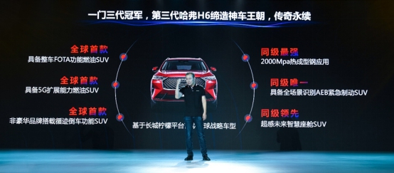 活動現(xiàn)場,長城汽車股份有限公司哈弗品牌總經(jīng)理王印明對第三代哈弗H6全球領(lǐng)先產(chǎn)品力進(jìn)行了解讀,他概括為三個點(diǎn)。