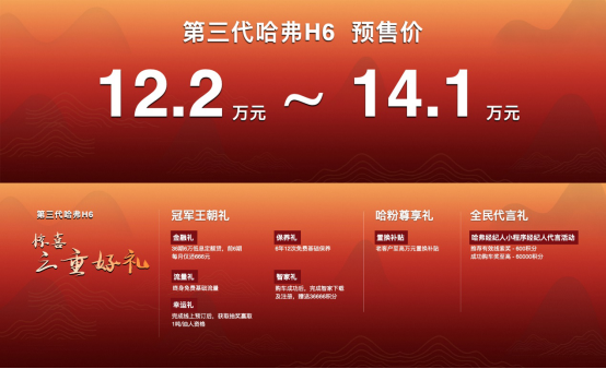 第三代哈弗H6以12.2萬—14.1萬元的預(yù)售價,給了消費者極大的驚喜。在驚喜價基礎(chǔ)上,為了消費者再享實惠,哈弗還推出冠軍王朝禮、哈粉尊享禮、全民代言禮三重好禮,其中冠軍王朝禮具體包括:36期6萬低息定額貸,前6期每月僅還666元的金融禮;6年12次免費基礎(chǔ)保養(yǎng)禮;基礎(chǔ)流量終身免費的流量禮。如果購車成功,還有智家禮,完成智家下載及注冊,將獲贈36666智家積分;如果完成了線上預(yù)訂,還將獲得抽獎贏取1噸油的幸運禮。其次,老客戶如果現(xiàn)在購車,還能獲得哈粉尊享禮,享受至高萬元置換補貼。此外,借助哈弗經(jīng)紀(jì)人小程序開展經(jīng)紀(jì)人代言活動,還將享有全民代言禮。推薦有效線索獎600積分,成功購車獎至高60000積分。