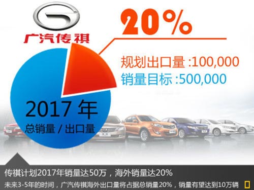 按照規(guī)劃,未來(lái)3-5年的時(shí)間,廣汽傳祺海外出口量將占據(jù)總銷量20%,也就是說(shuō)到2017年,廣汽傳祺的海外銷量有望達(dá)到10萬(wàn)輛,今年全年出口目標(biāo)為3000-5000輛。