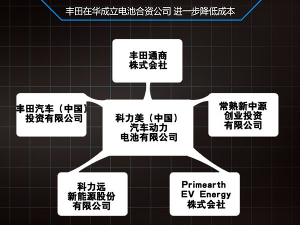 豐田汽車早在2011年就提出在三年內(nèi)通過(guò)國(guó)產(chǎn)混合動(dòng)力核心組件(電池、電機(jī)和電控系統(tǒng)),進(jìn)而擴(kuò)大新能源車型產(chǎn)能并減少生產(chǎn)成本,以此達(dá)到最大范圍普及混動(dòng)技術(shù)的目標(biāo)。此前豐田汽車(中國(guó))投資有限公司及豐田通商株式會(huì)社就與科力美、常熟新中源創(chuàng)業(yè)投資有限公司、Primearth EV Energy株式會(huì)社設(shè)立科力美(中國(guó))汽車動(dòng)力電池有限公司,用于開(kāi)發(fā)、制造 、銷售搭載于汽車的鎳氫蓄電池單體模塊,該公司制造的產(chǎn)品便是將用于豐田新能源汽車。