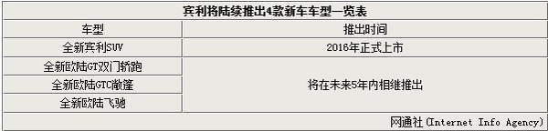 在賓利新車擴展陣營中,SUV車型將率先與消費者見面。賓利曾在2012年3月的日內瓦車展期間發布了EXP 9 F SUV概念車,而量產車型也將以概念車為藍本打造。近日賓利官方宣布,SUV車型將在賓利位于英國克魯郡總部的工廠投產,量產車型最快于2015年亮相,并于2016年正式與消費者見面。除此之外,賓利全新一代歐陸GT雙門轎跑、歐陸GTC敞篷以及歐陸飛馳將在未來5年內相繼推出,屆時賓利旗下新車產品陣容將增至4款。