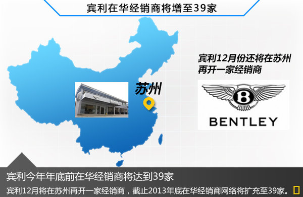 在經銷商網絡建設方面,賓利目前在華數量已達到38家。其中今年1至11月份賓利在華已增加了12家經銷商,加上12月份蘇州將設立的一家,截止2013年底賓利在華經銷商網絡將擴充至39家。此前賓利經銷商建設主要集中于東部沿海地區,在今年賓利則有意將經銷商網絡逐漸向中國中西部拓展。目前來看,賓利擴充在華經銷商數量將有利于賓利完善其在華的售后服務,進而滿足消費者的需求。