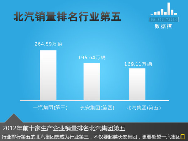 銷量方面,2012年前十家生產企業銷量排名第三的一汽集團年銷量為264.59萬輛;緊隨其后的長安集團年銷量為195.64萬輛;而北汽集團則為169.11萬輛,排名第五。很顯然,位列行業排行第五的北汽集團若想要成為行業第三,不僅要超越長安集團,更要超越位列第三的一汽集團,難度可想而知。在北汽重組昌河之后,是否能使得昌河汽車所處位置與北汽現有的產能布局形成互補,更快使得北汽達成行業前三的目標,值得期待。
