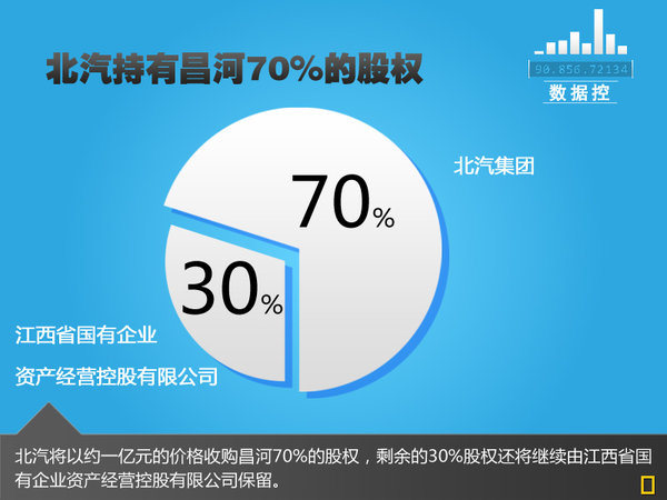 今日(11月25日)下午,北汽和昌河將正式簽署重組協議。未來重組后的昌河股權將被分為兩個部分,北汽將以約一億元的價格收購昌河70%的股權,剩余的30%股權還將繼續由江西省國有企業資產經營控股有限公司保留。股東雙方將于明年1月向昌河注入10億元資金。北汽在重組前期會先派出銷售以及財務人員支持昌河,并承諾到2020年累計向昌河投入270億元資金以及新產品。