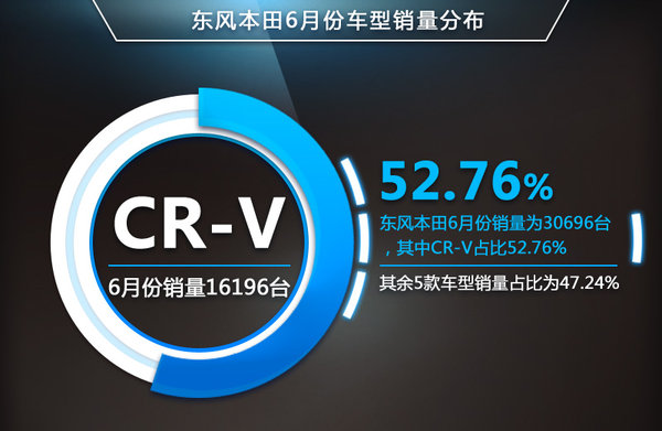 今年6月份,東風(fēng)本田產(chǎn)品共售出30696輛,其中CR-V銷量共有16196,占到52.76%,CR-V一款車型便撐起了東風(fēng)本田的“半壁江山”,并且在其細(xì)分市場中一直"獨(dú)占鰲頭",成為該級別標(biāo)桿車型,這也充分體現(xiàn)了SUV對于東風(fēng)本田的重要性。因此,東風(fēng)本田加速SUV產(chǎn)品線的擴(kuò)充將為其早日達(dá)到產(chǎn)銷百萬輛打下基礎(chǔ)。