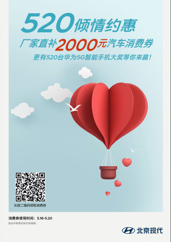 面向即將到來的“520”,北京現代再一次表白消費者,推出了“520傾情約惠,廠家直補消費券”活動 。根據活動規則,消費者可于5月11日-5月20日通過掃描活動二維碼等線上方式領取2,000元消費券(使用有效期:5月16日-5月20日),持券到北京現代全國授權4S店購車(全系車型適用),出示消費券并由4S店工作人員核銷確認后,即可抵2,000元購車款。