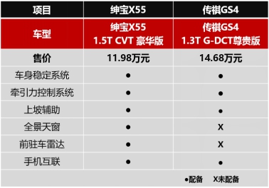 最低配車型如此,傳祺GS4的豪華版也有不少“水分”,和紳寶X55最高配相比,傳祺GS4沒有前置泊車雷達,沒有1.25㎡ 的全景天窗,傳祺GS4售價還是比紳寶X55高出2.7萬元。小編對比完價格與配置,“森森”震撼了:傳祺GS4的高價格到底花到哪里去了呢?